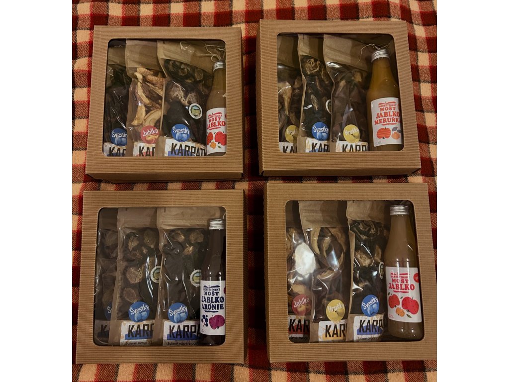 Tři balíčky sušeného ovoce Karpaty a jeden mošt z Hostětínské moštárny.